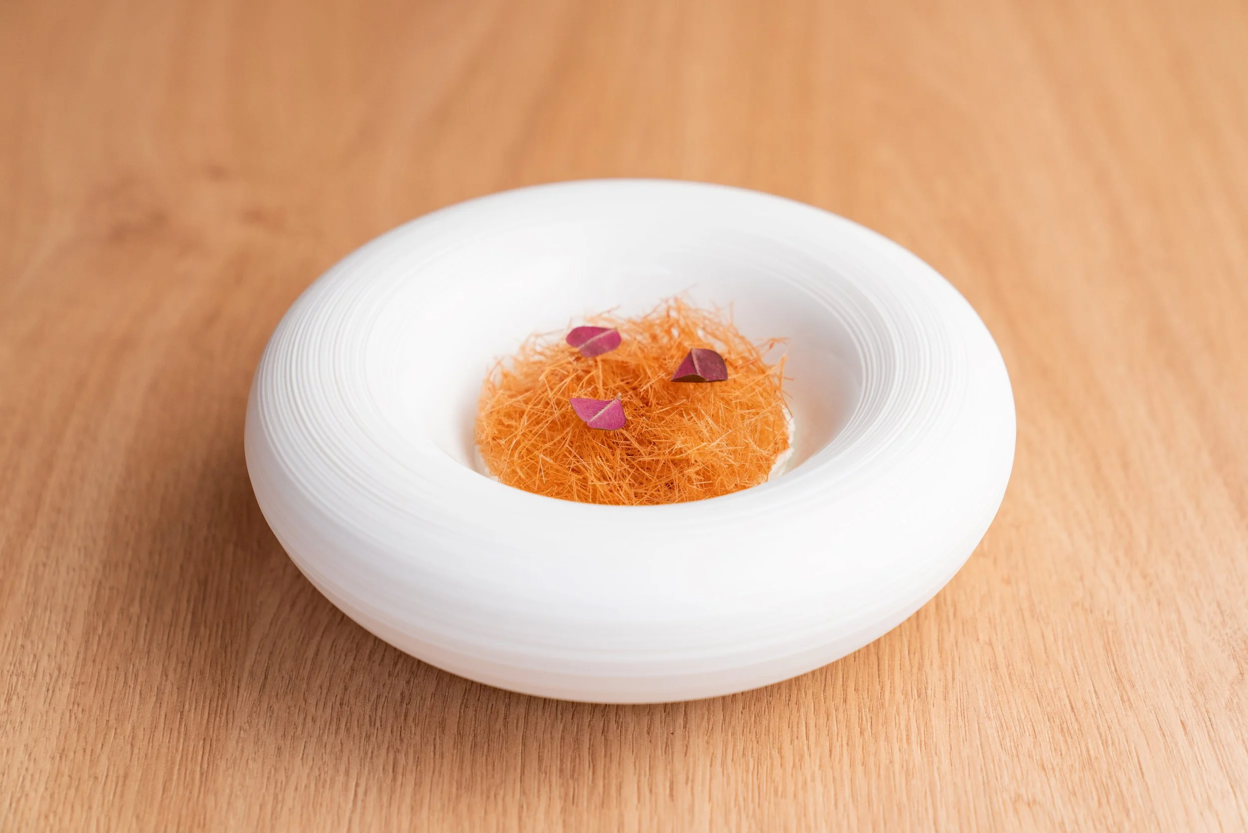 Tableware doesn’t just frame the food; it plays an active role in how it’s perceived. We choose each vessel carefully based on shape, size, texture, and colour—but also height. Varying the height of plates across a meal helps create rhythm and visual flow, drawing the eye in different directions and preventing monotony.