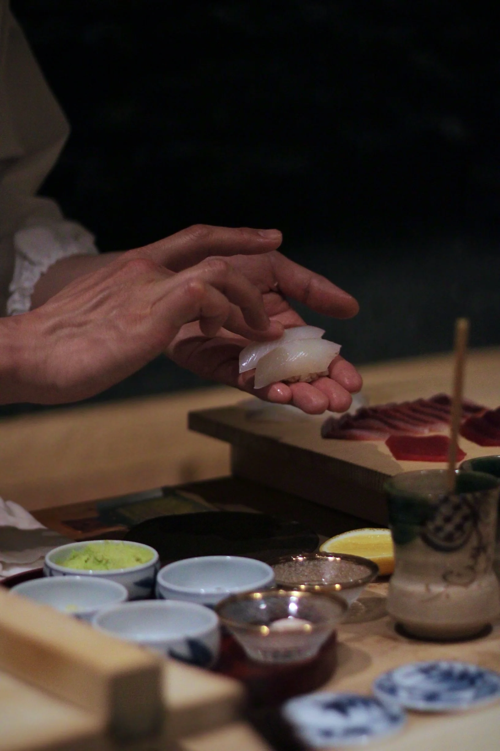 Lean fish such as sea bream or snapper may be taken out early to reach room temperature, while fattier cuts like chutoro or otoro are kept cool until just before serving. This prevents the fat from softening too quickly, allowing the fish to melt perfectly upon contact with the rice.